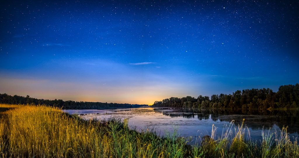 Das Foto zeigt den Altrhein bei Schwanau-Nonnenweier unter dem Sternenhimmel. Für das Foto wurden mehrere Einzelaufnahmen mit unterschiedlichen Belichtungen für Himmel und Landschaft angefertigt und anschließend am PC zu einem Panorama zusammengefügt.