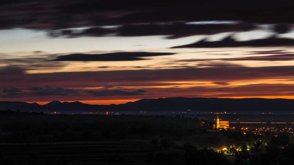 Panoramaaufnahme aus acht Hochkantfotos von der Rheinebene bei Ettenheim. An diesem Abend hat einfach alles gepasst: zuerst ein grandioser Sonnenuntergang, dann ein toller Wolkenhimmel und schönstes Dämmerlicht. Einfach fantastisch unsere Heimat! 🙂