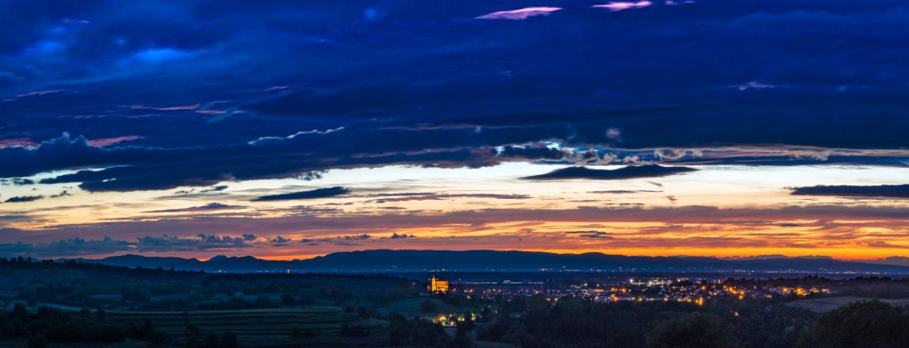 Panoramaaufnahme aus acht Hochkantfotos von der Rheinebene bei Ettenheim. An diesem Abend hat einfach alles gepasst: zuerst ein grandioser Sonnenuntergang, dann ein toller Wolkenhimmel und schönstes Dämmerlicht. Einfach fantastisch unsere Heimat! 🙂