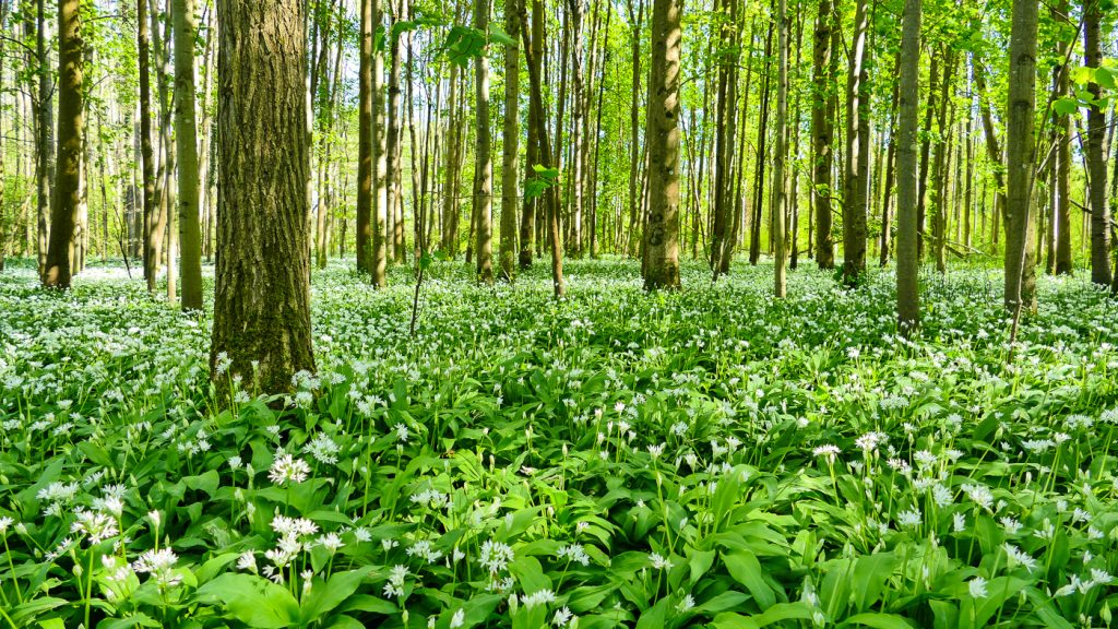 In den Rheinwäldern steht der Bärlauch in voller Blüte. Der Waldboden ist bedeckt mit einem weißen Blütenmeer und alles duftet und tausende Bienen schwirren durch die Luft. Einfach herrlich!
