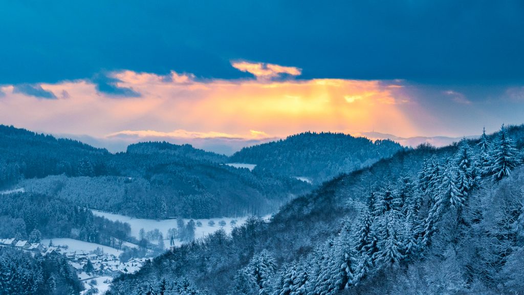 Winterlicher Sonnenuntergang über dem Bergdorf Schweighausen im Schuttertal.