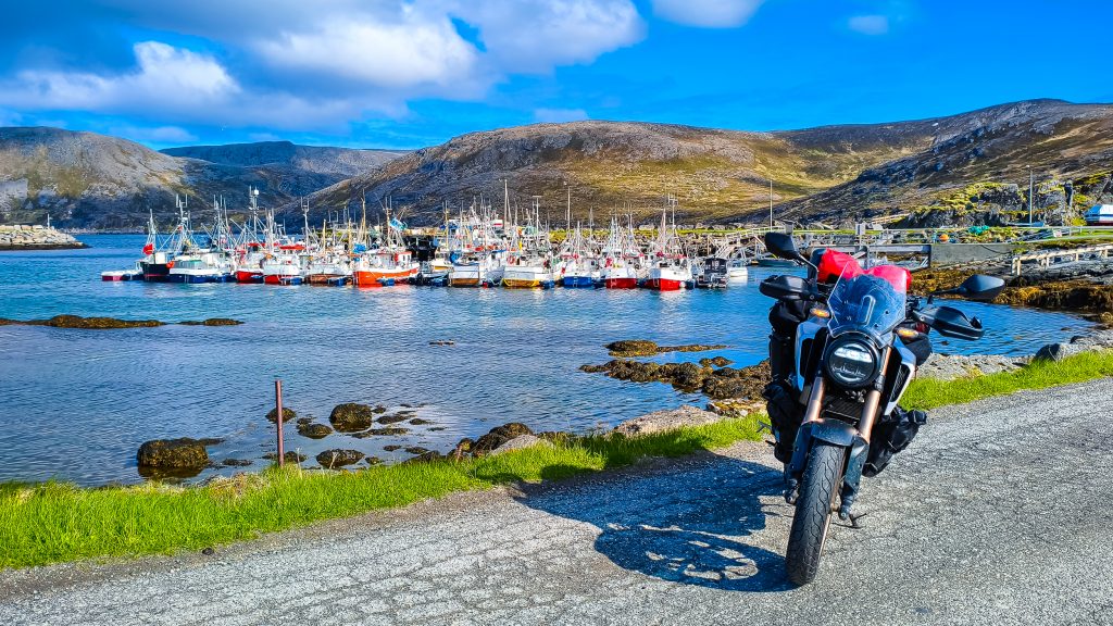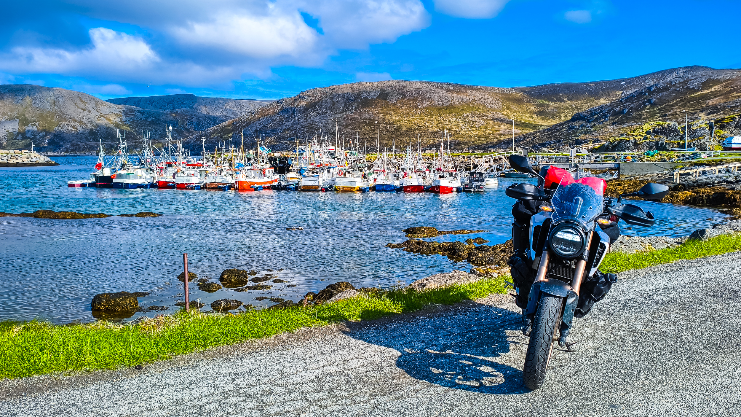 Kälte, Regen, starker Wind – die Fahrt über die Berge von Alta nach Honningsvåg verlangt mir alles ab. Die Straße windet sich durch graue, dramatische Felslandschaften und führt direkt am tosenden Eismeer entlang. Die Temperaturen sinken spürbar mit jedem Kilometer Richtung Norden. Schneegraupel und feine Hagelkörner prasseln auf mein Helmvisier, Windböen zerren an meiner kleinen Maschine, Gischt vom Meer treibt über die Fahrbahn. Es ist laut, kalt, anstrengend – und gleichzeitig absolut eindrucksvoll.