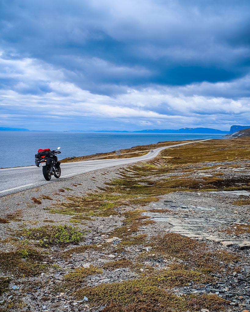Die Temperaturen sinken, je weiter ich in das nordische Fjell hinein fahre. Auf den Hochebenen von Nordreisa peitscht mir Graupel ins Gesicht, der Wind drückt das Motorrad zur Seite und ich fahre in permanenter Schräglage. Ich friere bis auf die Knochen – trotz mehrerer Kleidungsschichten. An diesem Tag verlangt mir das Wetter alles ab. Dennoch fahre ich weiter, in der Hoffnung, dass sich irgendwann ein Sonnenstrahl durch die Wolken kämpft.