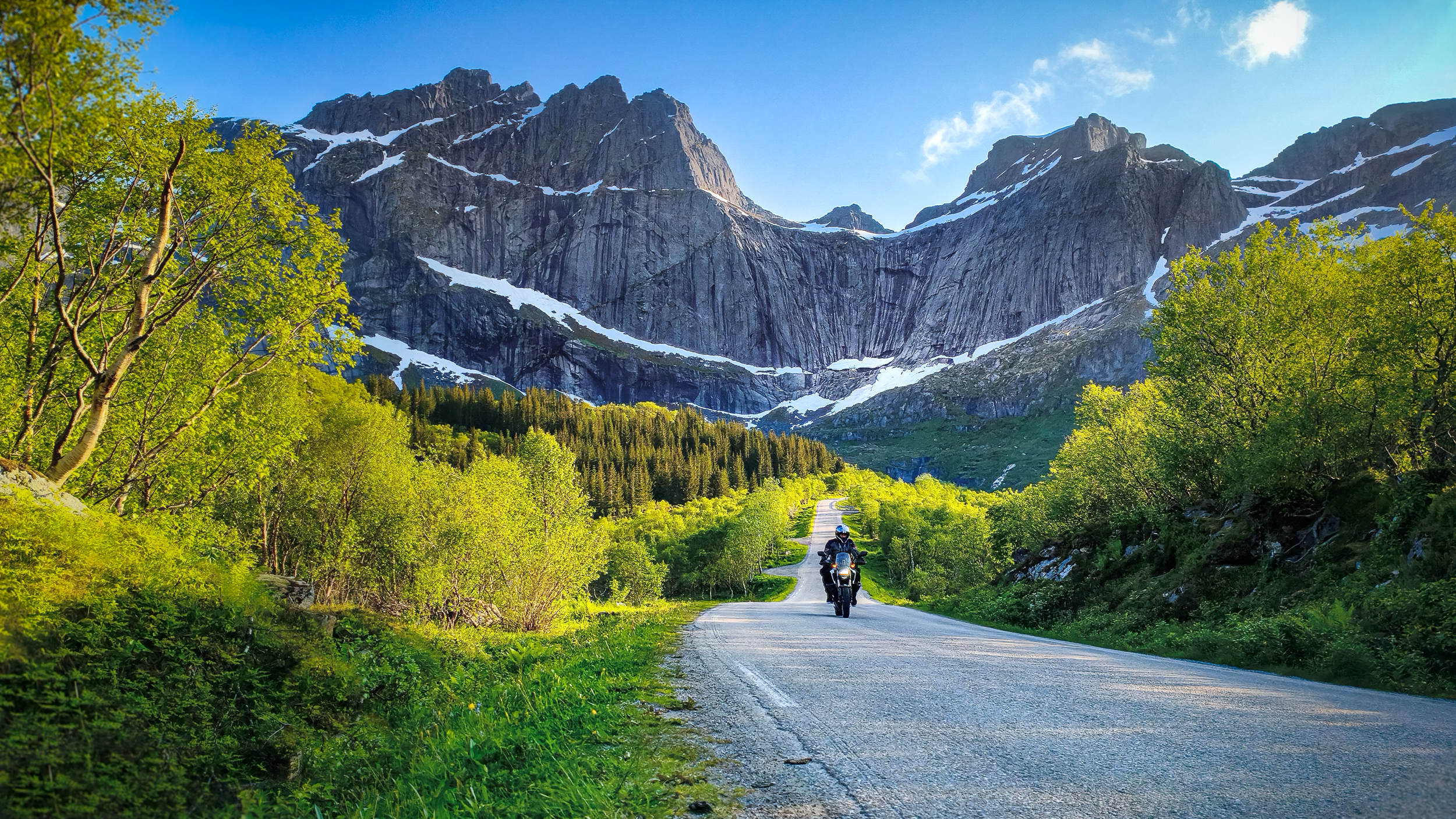 Bei Steinkjer erreiche ich das Ende der Küstenstraße und fahre weiter über Trondheim und Oppdal in das Dovrefjell-Gebirge. Dort zelte ich in frostigen Nächten ganz in der Nähe von wilden Moschusochsen am Ufer eines rauschenden Gebirgsflusses. In den Tagen darauf überquere ich das beeindruckende Sognefjellet – den höchsten Pass Nordeuropas – und rolle durch den Lærdalstunnel, den längsten Straßentunnel der Welt. Meine Tour geht weiter durch bekannte Regionen wie die Hardangervidda und vorbei an den gewaltigen Gipfeln des Jotunheimen Gebirges mit seinen mächtigen Gletschern. Wasserfälle, Hochebenen und Nationalparks säumen den Weg – und immer wieder diese atemberaubende Natur. Norwegen lässt mich nicht mehr los. Am Ende erreiche ich Kristiansand an der Südküste, setze mit der Fähre nach Dänemark über und rolle durch sommerlich-heiße Temperaturen zurück nach Hause.