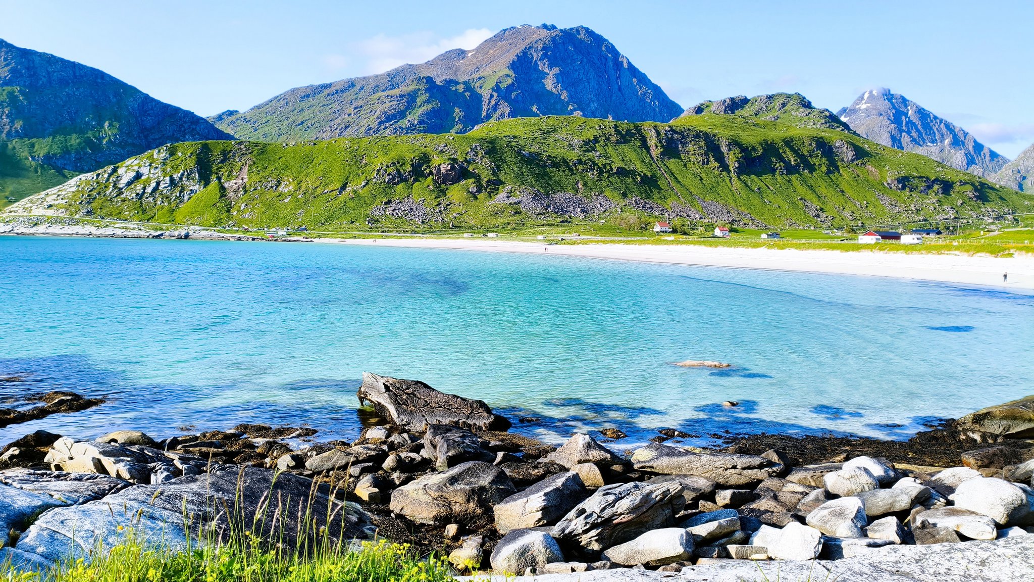In Nusfjord, einem der ältesten Fischerdörfer der Lofoten, spaziere ich zwischen den roten Rorbuer – den traditionellen Fischerhütten auf Stelzen. Hamnøya mit seinen gelben Häusern direkt am Wasser sieht aus wie gemalt. In Reine bleibt mir der Atem weg: Das Panorama aus Fjord, Bergen und typischen Hütten ist so perfekt, dass es fast unwirklich wirkt. Ich gönne mir eine kleine Pause am Hauklandstrand mit Blick aufs Meer – der Wind ist frisch, die Luft klar, und das Wasser so rein, dass man bis auf den Meeresboden schauen kann. Trotz kühler Temperaturen ein Ort zum Verweilen.