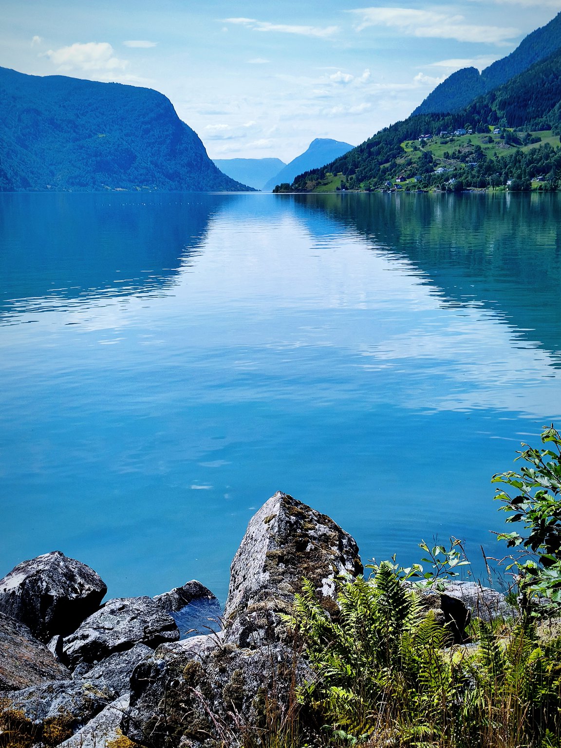 Ich fahre vorbei an tief eingeschnittenen Fjorden, steilen Berghängen, leuchtend grünen Wiesen und dichten Wäldern. Immer wieder halte ich an, um zu fotografieren – oder einfach zu staunen. Das Wetter ist wechselhaft: Regenschauer wechseln sich mit sonnigen Momenten ab, Nebelschwaden hängen über dem Wasser, und bei Nærøysund zeigt sich die Landschaft von ihrer mystischsten Seite. Besonders die Fahrt mit den kleinen Fähren hat etwas Meditatives. Ich lehne mich ans Geländer, schaue hinaus auf das Meer und spüre: Das hier ist echtes, unverfälschtes Norwegen.